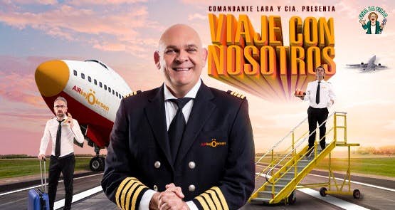 “VIAJE CON NOSOTROS” Un show en el que podremos disfrutar de un viaje lleno de chascarrillos y risas. Donde el Comandante Lara pilotará esta aventura, acompañado de su personal de cabina (Vicente Ru